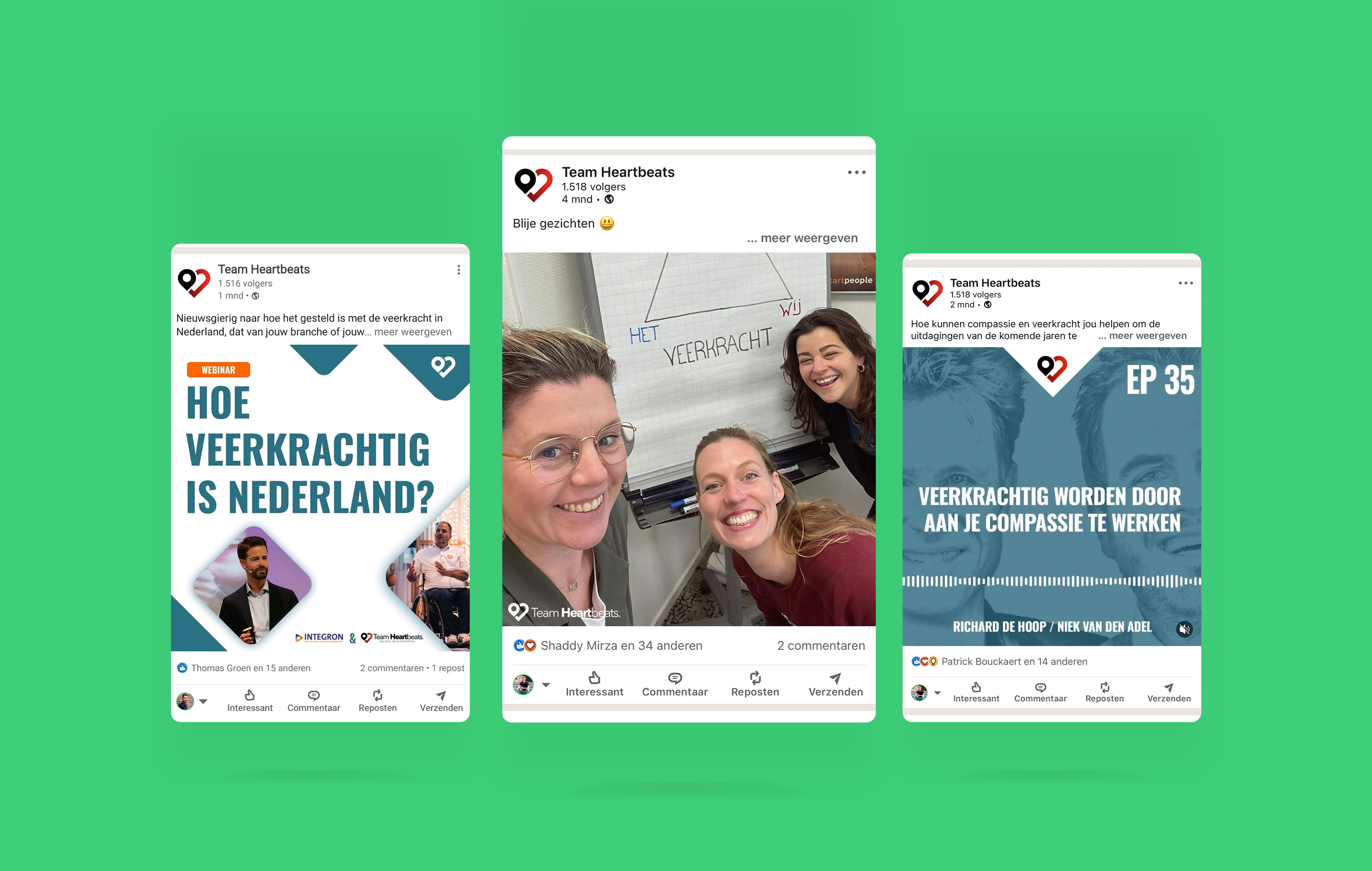 De uiteindelijke oplossing was een creatieve partnerschap. Zo was het onze taak om de unieke identiteit van Team Heartbeats (online) vorm te geven en de organisatie volledig te ontzorgen van alle ontwerp behoeftes. Op de dag van vandaag zijn we nog steeds de creatieve partner van Team Heartbeats en blijven we meedenken, om hun online zichtbaarheid te vergroten. Want klaar dat zijn we nooit. Van het ontwikkelen van een huisstijl tot de social media bijhouden, we ontzorgen team Heartbeats volledig zodat zij zich kunnen focussen op wat telt: ‘Mensen veerkrachtig maken.’